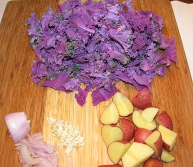 Place potatoes in a saute pan with a small amount of water. Bring to a boil, cover and cook 10 minutes or less till potatoes are fork tender, not too soft. Remove from pan and set aside. Clean saute pan and dry thoroughly. Heat pan and add 2 T. olive oil. Saute cooked potatoes on medium high till golden brown. Add shallots and garlic and cook till shallots just begin to softened being careful not to burn the garlic. Add the chopped kale, sprinkle with a little salt and pepper. Add 2-3 T. water. Combine all ingredients, cover, keeping temperature around medium high and steam the kale till spines have become tender and most of the water has cooked down. Remove lid, drizzle with a very small amount of the balsamic vinegar, stir together and serve. As a side dish, enough for 2-3 people.